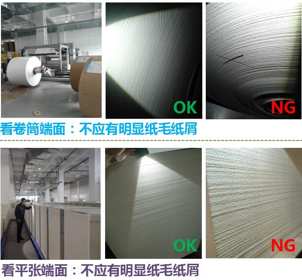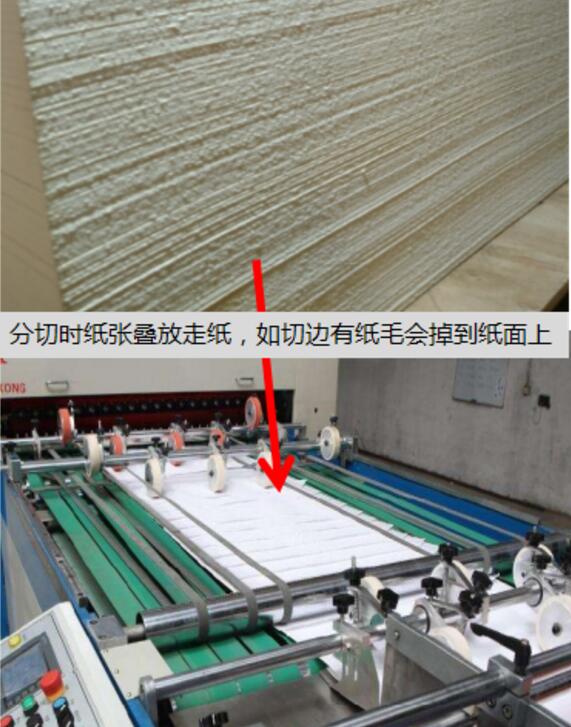 圖3:借助電筒光查看紙張端面分切品質(zhì) 特別需要注意的是,紙張?jiān)诜智羞^(guò)程中是重疊走紙,如切邊紙毛紙屑多,在分切過(guò)程中就會(huì)把紙毛帶入到紙面,后續(xù)再修邊也無(wú)濟(jì)于事。