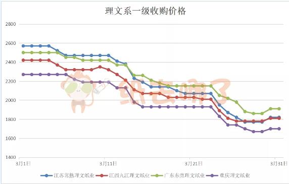 3月理文系一級(jí)紙收購(gòu)價(jià)格走勢(shì)下行,在月末開(kāi)始回暖。 從2月29日起,截至3月31日上午,江蘇理文下跌750元/噸,江西理文下跌560元/噸,廣東理文下跌590元/噸,重慶理文下跌570元/噸。 理文系一級(jí)紙以廣東理文最高,為1910元/噸;重慶理文最低,為1700元/噸。 玖龍系A(chǔ)級(jí)收購(gòu)價(jià)格走勢(shì)