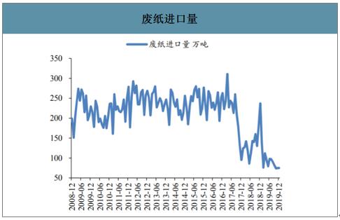 隨著消費升級和環境保護產能清退,白卡紙對于白板紙的替代作用逐步增強。白卡紙、白板紙都可用于紙盒制作,由于白卡紙質地平滑,堅挺度較高,且相對耐磨和防水,在食物包裝等領域具有優勢,且白卡紙可以匹配多種印刷模式進行多樣化營銷操作,對于企業吸引力更強。近年來隨著消費升級,市場對于白卡紙的需求增速較快。白卡紙用于制造紙盒的消費占比由2013年的60%明顯提升至2016年的80%。同時廢紙進口作為再生白紙板的原料,隨著固廢進口量的減少廢紙供應下降,對于白板紙的生產供應預計帶來較大沖擊。 廢紙進口量
