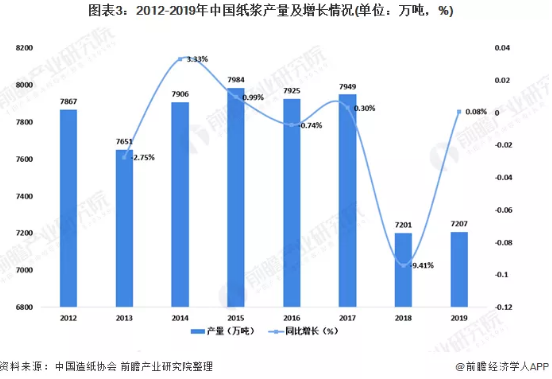 紙漿產(chǎn)量小幅回升 隨著我國經(jīng)濟(jì)環(huán)境不斷改善,國家對可再生資源利用的不斷支持。我國紙漿生產(chǎn)也進(jìn)入了新的階段,2012年以來,我國紙漿生產(chǎn)始終維持在7000萬噸以上,近期由于環(huán)保政策趨嚴(yán),不符合標(biāo)準(zhǔn)的制漿企業(yè)逐步關(guān)停,導(dǎo)致我國紙漿產(chǎn)量有所下降。根據(jù)中國造紙協(xié)會統(tǒng)計數(shù)據(jù)顯示,2019年我國紙漿產(chǎn)量為7207萬噸,較2018年同比下降0.08%。