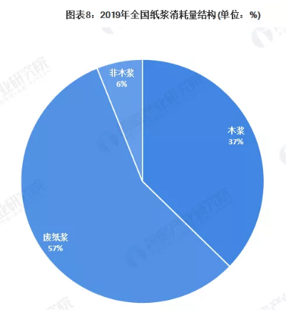 從紙漿的消耗種類來看,2019年全國木漿消耗量為3581,占紙漿消耗總量的37%;廢紙漿消耗量為5443萬噸,占紙漿消耗總量的57%;非木漿消耗量為585萬噸,占紙漿消耗總量的6%。