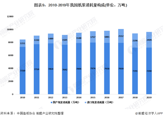 進(jìn)口廢紙漿比重增大 近年來,由于國內(nèi)環(huán)保政策的逐漸加強(qiáng),我國對進(jìn)口紙漿的消耗量逐漸增加。2019年我國進(jìn)口廢紙漿消耗量為2409萬噸,同比增長9.7%。