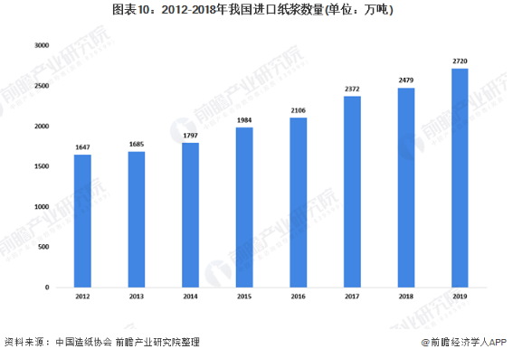 2012年以來,我國進(jìn)口紙漿的數(shù)量逐年增加。2019年我國紙漿進(jìn)口量為2479,同比增長9.72%。中國造紙協(xié)會表示,從長期看,我國紙漿將長期保持較大的進(jìn)口量。除去直接進(jìn)口紙漿之外,我國國產(chǎn)紙漿的原料中也有大部分依賴進(jìn)口。