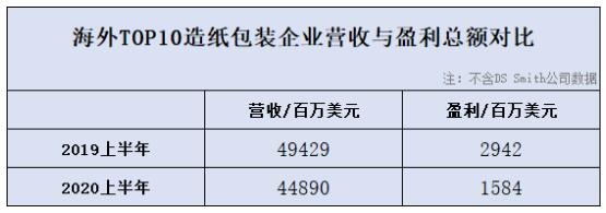從圖表中不難看出,由于疫情肆虐,2020年上半年海外造紙包裝頭部企業(yè)營(yíng)收及盈利水平普遍產(chǎn)生了不同程度的數(shù)據(jù)下滑。排除尚未披露數(shù)據(jù)的DS Smith,榜單上企業(yè)2020年上半年?duì)I收總額同比驟減近45.4億美元(折合人民幣約307億元),盈利總額下降近13.6億美元(折合人民幣約92億元)。