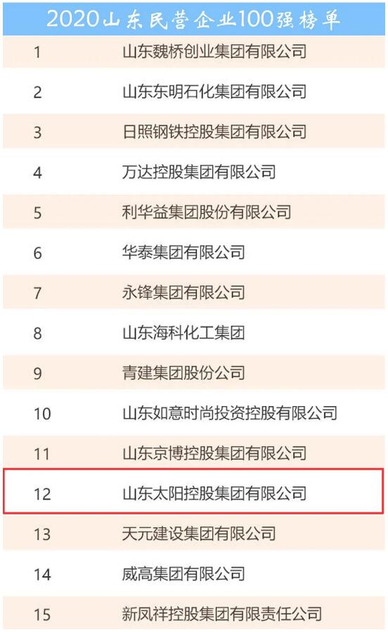 10月20日下午,山東省領軍民營企業座談會暨山東省“十強”產業民營企業10強榜單、民營企業100強發布會在濟南召開。山東太陽控股集團有限公司(以下簡稱:太陽控股集團)再次蟬聯山東民營企業100強,位列第12位,與去年相比排名提升了5個位次。省委副書記、省長李干杰出席會議并作重要講話,省人大常委會副主任、省工商聯主席王隨蓮,副省長凌文出席會議,太陽紙業副總經理陳昭軍參加會議并領取獎牌。