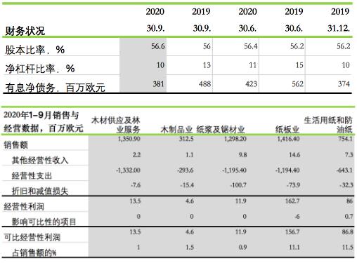 芬林集團財務報告 2020年1-9月 2020年1-9月 (與2019年1-9月相比) 銷售額為36.98億歐元(去年同期:41.83億歐元)。 經營性利潤為2.79億歐元(去年同期:3.42億歐元)。可比經營性利潤為2.74億歐元(去年同期:4.18億歐元)。 稅前利潤為2.42億歐元(去年同期:2.98億歐元)。可比稅前利潤為2.36億歐元(去年同期:3.74億歐元)。 可比已占用資本回報率為7.0%(去年同期:11.0%)。 經營現金流為4.19億歐元(去年同期:4.21億歐元)。 2020年7-9月 (與2019年7-9月相比) 銷售額為12.45億歐元(去年同期:13.74億歐元)。 經營性利潤為1.16億歐元(去年同期:1.10億歐元)。可比經營性利潤為1.15億歐元(去年同期:1.10億歐元)。 稅前利潤為1.03億歐元(去年同期:9600萬歐元)。可比稅前利潤為1.02億歐元(去年同期:9600萬歐元)。 可比已占用資本回報率為8.8%(去年同期:8.7%)。 經營現金流為1.79億歐元(去年同期:2.39億歐元)。 2020年第三季度主要事件 與上一季度相比,長纖漿的平均美元市場價格略有下降,短纖漿的平均美元市場價格保持穩定。不過,兩種漿的價格均低于去年同期。 紙板的交付量相當于去年同期水平,平均價格保持相對穩定。 集團在芬蘭艾內科斯基(Äänekoski)新落成紙板和包裝設計卓越中心(Excellence Centre)。 芬林芬寶就凱米(Kemi)生物制品廠項目簽署了廢水處理廠、二氧化氯廠和木材加工設備的初步合同。 勞馬(Rauma)鋸木廠的建設按計劃開展。 創新公司芬林之春(Metsä Spring) 和維美德(Valmet)達成協議,將在艾內科斯基建立木基3D纖維產品試驗工廠。 新冠肺炎疫情大流行 在阻止新冠疫情大流行方面,芬林集團在運營中具有三個優先重點:人員安全、履行社會責任全力參與抗擊疫情、確保業務連續性。芬林集團遵循并遵守政府機構發布的新冠疫情指南。避免身體接觸是最重要的預防措施。 在新冠疫情大流行期間,芬林集團的資源狀況保持正常。通過在工作場所實施嚴格的安全措施可以防止感染鏈。 2020年10-12月績效預測 2020年第四季度,芬林集團的可比經營性利潤預計將比2020年第三季度有所下降。 芬林集團總裁兼首席執行官何亦凱(Ilkka Hämälä)表示: “芬林集團在2020年第三季度的業績好于我們在本季度初的預期。與我們此前的估計相比,最顯著的改善來自紙板業務,其銷量高于預期且價格保持穩定。在紙漿業務方面,本季度中國市場需求回升,亞洲市場的價格變化也較為有利。木制品業務也略強于預期。到目前為止,與上一季度相比,歐洲疫情的惡化尚未反映在我們需求結構的變化中。在第三季度中,我們仍能保持工廠的正常利用率。 面對疫情大流行引起的特殊情況,集團仍按照春季采用的特殊運營模式展開運營。在我們的9000多名員工中,已檢測到30例新冠肺炎感染病例。但我們的工作場所未發現感染鏈。我們能夠按計劃繼續開展業務運營和項目開發。 停機維護已從第三季度起開始執行。我們將原定于今年上半年的停機推遲到下半年,這意味著我們所有紙漿和紙板廠將在第三和第四季度陸續組織停機維護。在第三季度中,開展停機維護的主要包括芬蘭凱米工廠和瑞典胡蘇姆 (Husum)一體化工廠,它們在特殊情況下安全地完成了工作,沒有發現新冠肺炎感染病例。 我們的開發投資項目正不斷取得進展。勞馬鋸木廠項目已從土方工程進入施工階段。設備安裝將于明年初開始。凱米生物制品廠繼續開展項目準備工作,包括實施規劃和現場準備。關于環境許可方面的決定有望在今年年底前公布,此后集團將啟動做出投資決定的準備工作。大部分主要設備購買協議已簽署,并將取決于最終的投資決定。關于胡蘇姆工廠回收鍋爐的投資決定已被推遲,原因是環境許可流程的時間長于預期,許可證有望在今年年底之前頒發。 芬林集團旗下創新公司芬林之春決定與維美德合作,在艾內科斯基建設3D纖維包裝試驗工廠。該項目旨在開發新的生產技術,用于生產高質量的纖維基包裝。這款新材料可以用來代替食品包裝中的塑料。由芬林之春和日本伊藤忠商事株式會社共同投資的紡織纖維試驗工廠已開始運營。新材料的首批測試樣品已下線,用于下一步加工階段的測試。 芬蘭集團通過運營來滿足人們對可再生材料制成產品的日常需求。我們正積極開展運營,更好地結合與北歐森林有關的生態和經濟目標,持續改進我們的生產和運營流程,為消費者推出可再生、資源效率更高的產品。” 關鍵數據