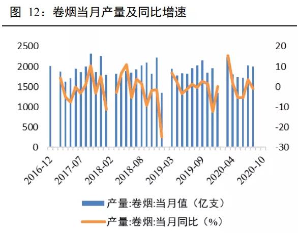 2020年1-10月,飲料類零售額累計值為1843.5億元,同比增長12.8%。10 月,飲料類零售額為201.8億元,同比增加16.9%。2020年1-10月,卷煙累計產量為20684.7億支,累計同比增加1.7%。10月,卷煙當月產量為1721.7 億支,同比下滑7.2%。