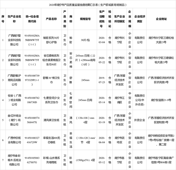 2020年12月31日,廣西南寧市市場監督管理局網站公布2020年家用紙制品產品質量監督抽查情況,共抽查18批次樣品,其中8批次為衛生巾(含衛生護墊)產品、10批次為衛生紙產品。經檢驗,18批次均為合格產品,不合格產品檢出率為0。其中,生產領域共抽取7批次產品,合格7批次,不合格0批次,不合格產品檢出率為0;流通領域共抽取11批次產品,合格11批次,不合格0批次,不合格產品檢出率為0。