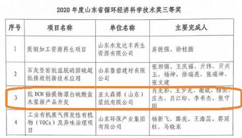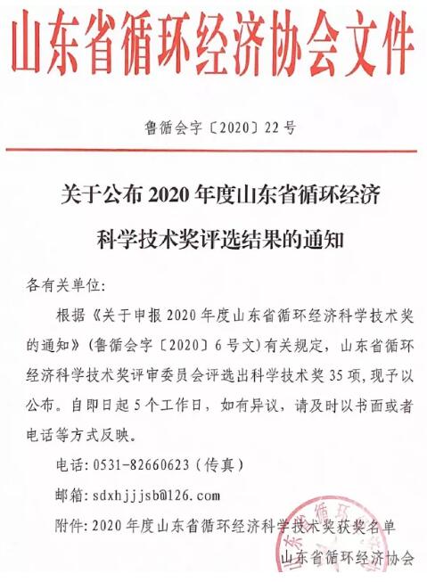 近日,山東省循環(huán)經(jīng)濟(jì)協(xié)會發(fā)布了《關(guān)于公布2020年度山東省循環(huán)經(jīng)濟(jì)科學(xué)技術(shù)獎評選結(jié)果的通知》(魯循會字[2020]22號),對評選出的35項(xiàng)科學(xué)技術(shù)獎予以公布。公司完成的“低DCM抽提物漂白硫酸鹽木漿新產(chǎn)品開發(fā)”項(xiàng)目,榮獲“山東省循環(huán)經(jīng)濟(jì)科學(xué)技術(shù)獎三等獎”,是制漿造紙行業(yè)唯一獲獎項(xiàng)目。