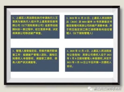 導語:臨近年關(guān),又有兩家包裝印刷廠因經(jīng)營不善破產(chǎn)清算。一家是位于河南省的三門峽藍雪包裝有限公司,另一家是位于浙江的紹興市上虞英桀包裝有限公司。 1、三門峽藍雪包裝有限公司管理人全面開展破產(chǎn)清算工作 2021年1月25日早8點,在河南省三門峽市中級人民法院清算與破產(chǎn)審判庭辦案人員的指導和監(jiān)督下,由恒翔所律師組成的破產(chǎn)管理人團隊趕赴三門峽藍雪包裝有限公司開始全面接管三門峽藍雪包裝有限公司。 本次管理人接管的資產(chǎn)包括債務人機器設備、公章印鑒及財務賬簿等,這標志著三門峽藍雪包裝有限公司的破產(chǎn)清算工作全面啟動。 自接受中院指定管理人后,恒翔所管理人團隊嚴格按照破產(chǎn)法的規(guī)定開展工作,忠實履職、勤勉盡責,為全面依法維護債權(quán)人、債務人等合法權(quán)益不斷戮力前行。 2、紹興市上虞英桀包裝有限公司破產(chǎn)清算案第一次債權(quán)人云端會議召開 2021年1月14日上午10時30分,紹興市上虞英桀包裝有限公司破產(chǎn)清算案第一次債權(quán)人線上會議順利召開。 為方便債權(quán)人參與債權(quán)人會議,積極響應疫情防控號召,提高審理效率,節(jié)省會議成本,經(jīng)充分考量,決定通過“浙江移動微法院平臺”召開第一次債權(quán)人會議。這不僅有便于債權(quán)人,也充分保障了債權(quán)人的知情權(quán)與參與權(quán),與線下債權(quán)人會議具有同等法律效力。 一、 基本情況