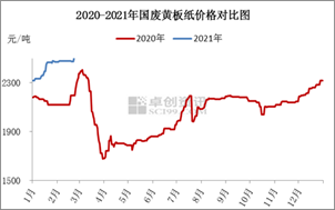 據(jù)卓創(chuàng)資訊監(jiān)測(cè)數(shù)據(jù)顯示,2月國(guó)廢黃板紙均價(jià)為2486元/噸,月環(huán)比上漲3.71%,月同比上漲15.15%。2月國(guó)廢黃板紙到廠價(jià)繼續(xù)上漲,僅春節(jié)假期期間價(jià)格穩(wěn)定,因市場(chǎng)交投停止。國(guó)外疫情升溫后,海運(yùn)運(yùn)力下降、運(yùn)費(fèi)上漲,促使進(jìn)口原料價(jià)格上漲,包括廢紙漿、成品紙、紙漿的進(jìn)口價(jià)格,在此背景下,加2021年之進(jìn)口廢紙數(shù)量清零,那么大型紙廠積極增加國(guó)產(chǎn)廢紙庫(kù)存儲(chǔ)備以應(yīng)對(duì)原料供應(yīng)缺口。這使得國(guó)內(nèi)廢黃板紙市場(chǎng)長(zhǎng)期處于供小于求狀態(tài),促使其市場(chǎng)價(jià)格的連續(xù)上漲。