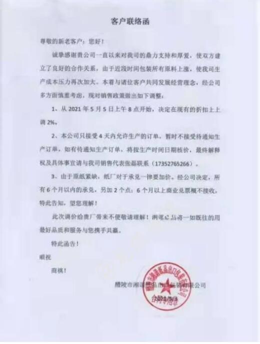 隨著五一假期逐步結束,玖龍紙業優惠政策即將取消,原紙、紙板市場也將發生異動。據悉,目前北方部分地區原紙價格上漲50元/噸,江蘇、湖南等南方省市紙板價格小幅上調2%-5%。 山東省美潔紙業有限公司 從5月4日起,瓦楞紙/紗管紙價格在原基礎統一上調50元/噸。 儀征市美優紙業有限公司 從2021年5月3日起,紙板及紙箱在原價格基礎上上調5%。 醴陵市湘諧紙品出口包裝有限公司 從5月5日上午8點開始,在現有折扣基礎上上漲2%。  而在產業鏈最上游的廢紙端,五一假期期間,國廢價格持續上漲,各類紙企普遍上調20-50元/噸。以5月5日為例,當天共有近30家紙企上調國廢收購價,華東地區漲價的紙廠數量最多,其中不乏太倉玖龍、九江理文、漳州聯盛等知名紙廠。 從當前的形勢來看,五一假期結束后,國廢以及原紙、紙板市場或會出現穩中上調的局勢,但難以在全國范圍內引起大規模上漲。同時,玖龍紙業的價格動向也將在一定程度上左右整體的市場變化,建議包裝企業密切關注。 附:最新國廢收購價(5月6日) 江蘇: 淮安恒潤紙業5月6日黃板廢紙各級上調30元,A1910,B1860,C1810,D1760。現金收購(地址:淮安區平橋鎮) 江蘇揚州永豐余紙業(5月6日起)廢紙價格漲40元/噸。調整后國內回收紙價格為(廠價):一級紙(紙器紙)2220元/噸,超市紙2190元,二級紙2160元/噸,三級紙2050元/噸。中間商報回收紙價格調整為:一級紙(紙器紙)2290元/噸,超市紙2260元/噸,二級紙2230元/噸,三級紙2120元/噸。(注:中間商報價有不同) 江蘇理文05月06日(星期四)國廢收貨執行價格:1)一級:2430元/噸(上調30)2)二級A:2230元/噸(上調30)3)二級:2190元/噸(上調40)4)三級:2080元/噸(上調40) 5月6日起,江蘇徐州建平紙廠,廢紙價格上調30元/噸。調整后不帶票到廠價:A級:2020元90%黃板B級:1970元80%黃板C級:1910元50%黃板D級:1770元。 浙江: 通知:各位客戶,浙江和泓環保紙業有限公司5月6日起,各類廢紙收購價格上調50元/噸。青板2130元/噸,黃板含量大于95%。一級黃板,2120元/噸,二級A,2050元/噸,二級B,1950元/噸,二級通紙,2000元/噸,三級A,1900元/噸,三級B,1800元/噸,三級通紙,1850元/噸,灰黃板A,1870元/噸,灰黃板B,1820元/噸,灰黃板C,1770元/噸。 浙江華川實業(原義烏義南紙業)有限公司自5月6日起,廢紙收購價調整為A級黃板:2270元/噸B級黃板:2220元/噸C級黃板:2150元/噸統貨:2070元/噸,純大管1970元/噸;純小管1860元/噸;管子1760元/噸,(漲30,大小管不變) 5月6日起廢紙收購價格調整為:甲牛2890元,特掛2310元,普掛2250元,廠紙2200元,超市紙2150元一2100元,統貨紙2030元,純大管1900元,小管1800元。溫馨提示:疫情期間:所有來貨司機,進入廠區全程按標準戴好口罩,司機不準下車隨意走動!浙江秀舟紙業(甲牛不變,其他漲20-40) 安徽: 安徽滁州兆隆紙業(5月6日起)廢紙價格上調30元/噸。調整后執行外調紙不帶票到廠價:AA打包紙2290元/噸,A級打包紙2250元/噸,B級打包紙2180元/噸。原T級取消并入AA級。門市收購價:門市(天長)打包紙外調同級別同價,散紙同級別低70元/噸。如有故意摻雜和加水現象,公司將加倍處罰!公司對廢紙的質量要求不變。 江西: 各位客戶:5月6日起,公司決定廢紙價格執行:A級2150元/噸,B級2050元/噸,C級1950元/噸,D級1850元/噸,E級1650元/噸,三級垃圾包拒收,打包統書2050元/噸,散統書2000元/噸!請各位客戶嚴控質量標準,感謝您的支持!江西萬載金柯紙業采購(漲30) 湖北: 仙桃盛大5月6日開始廢紙收購執行價格如下(漲30元)。特級2370元1級2320元2級2270元3級2220元4級2170元, 廣東: 廣東/東莞理文5月6日(星期四)起國廢收貨執行價格:(1)一級紙:2460元/噸(上調40);(2)二級紙:2250元/噸(上調40);(3)一級辦公室紙:2520元/噸(不變);(4)頁子紙A:2420元/噸(不變);(5)頁子紙B:2320元/噸(不變);(6)二白小花:2270元/噸(不變);(7)小花:2170元/噸(不變)。 金洲紙業通知:5月6日紙皮價格升30元一級紙2510(一級紙為純黃工廠切邊、紙板,工業回收的紙箱、大煙箱紙、純黃大商場(大超市)紙等純黃紙皮,雜紙比例5%-10%);二級紙2460(純黃紙箱紙、超市紙皮、小商店紙皮、社會回收紙皮,雜紙比例10%-50%,啤酒廠初次回收的純啤酒箱、純商業大張花紙皮);純坑卡2410(純工廠邊角料坑卡、經回收分選后純坑卡)三級紙2410(雜紙比例50%-70%);特此通知 【中南公司】送貨東莞玖龍5月6日起到廠價格如下:(1)甲級牛皮紙3000元;(2)乙級牛皮紙2780元;(3)A級:2490元/噸;(4)B級:2450元/噸;(5)C級:2390元/噸;(6)統貨(C級):2390元/噸;(7)D級:2330元/噸;(8)E級:2270元/噸;(9)純啤酒箱:2390元/噸;(10)坑紙:2250元/噸(11)卡紙:2090元/噸;(12)廢雜紙:2090元/噸;(13)A級花管:2120元/噸;(14)混合純白紙:2510元/噸;(15)頁子紙:2430元/噸;(16)頁子紙B級:2350元/噸;(17)工廠小花:2310元/噸;(18)小花卡紙:2250元/噸;(19)社會小花:2250元/噸;(20)書本紙:2250/噸;(21)混合花廢紙:2170元/噸。(黃廢類上調50元,白廢類價格不變,補貼0) 送中山永發廢紙參考價格如下:特A級2320,特級(B級)2290、純黃紙皮(C級/大統)2260、純啤酒箱2260、純彩箱(統貨)2260,純坑卡2230,(漲40);以上價格自2021年5月6日起執行,請知悉,謝謝 送中山聯合鴻興廢紙參考價格如下:特A級2320、特級(B級)2290,純黃紙皮(C級/大統)2260、純啤酒箱2260、純彩箱(統貨)2260、純坑卡2230,(漲40);以上價格自2021年5月6日起執行,請知悉,謝謝 【金田紙業】各供應商:從5月6日起,一級紙皮2400元/噸;紙皮A類2350元/噸;紙皮統貨A級2310元/噸,紙皮統貨B級2250元/噸;坑卡A級2050元/噸;坑卡B級2020元/噸;廠包純坑卡及薄灰2