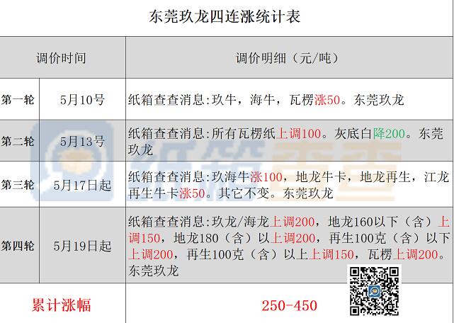 連漲4輪!玖龍用實力證明了市場的瘋狂...... 1、玖龍再漲200元 5月19號,玖龍多基地原紙再次上調(diào)200,隨著玖龍的連續(xù)4輪漲價,紙板廠深感自己掉隊了,紙板漲價速度遠遠跟不上原紙廠漲價的速度,造紙廠說漲就漲,不留余地,沒等紙板廠反應(yīng)過來,下游的紙箱廠已經(jīng)把訂單塞過來,新訂單老價格,紙板廠成為本輪漲價最大的背鍋俠…… 讓我們來重新回顧一下玖龍的漲價過程:  紙箱查查建議:目前市場屬于強拉之勢,紙板廠必要時可以采用緊急停單措施,或者一日多次漲價來避免嚴重損失,紙箱廠可以提前大量備貨,爭取一波漲價紅利。 2、 原紙價格走勢