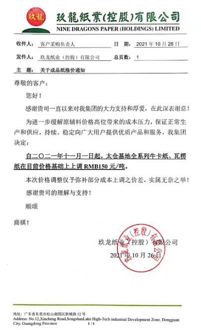 天津/河北玖龍:11月1日起,全系列牛卡紙、瓦楞紙、白面/涂布牛卡紙漲價100元/噸。