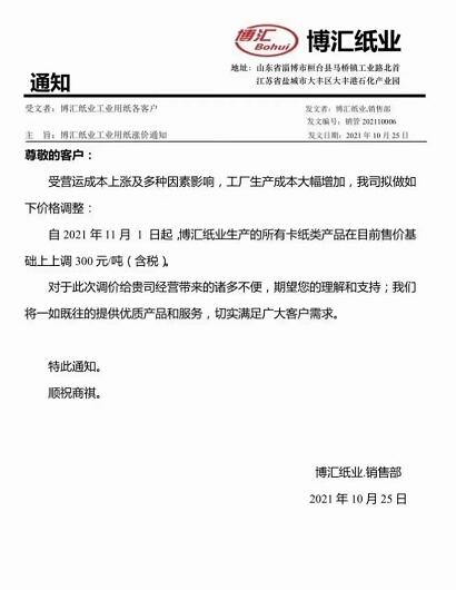 博匯紙業 自2021年11月1日起,博匯紙業生產的所有卡紙類產品在目前售價基礎上上調300元/噸(含稅)。