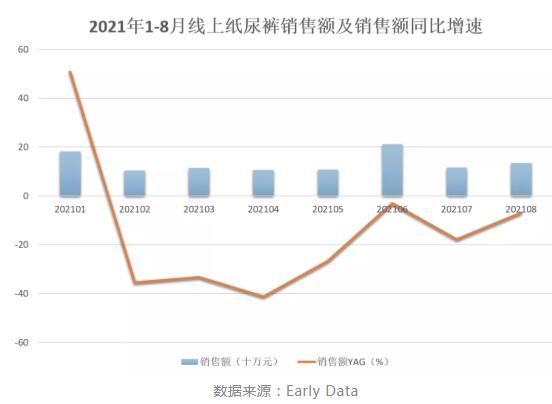 今年以來我國紙尿褲市場規模有所下降,而這一態勢在線上尤為顯著。無論多惡劣的行業環境,具有遠大格局且勇于探索品牌依舊能穩定增長。縱觀2021,紙尿褲行業有哪些增長之道? 01、紙尿褲線上銷售額下滑15.3% Early Data數據顯示,綜合阿里、京東兩大電商平臺,2021年1-8月線上紙尿褲總銷售額同比下滑15.3%;總銷量1.074億件,同比下滑13.3%,紙尿褲線上市場規模萎縮。 從1-8月銷售額增速走勢看,紙尿褲線上銷售額增速在2021年4月觸底反彈,并于6月(618大促)登上頂峰。