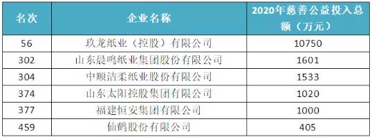 2021年12月18日,以“財富與責任——企業的價值”為主題第五屆中國企業慈善公益論壇在涪陵舉行。 會上發布了2021中國企業慈善公益500強、中國企業抗洪捐贈500強、中國慈善企業家、中國十大最受尊敬企業和中國十大愛心扶殘企業名單,多家造紙企業上榜。