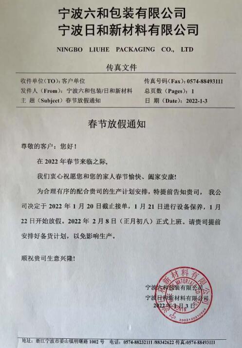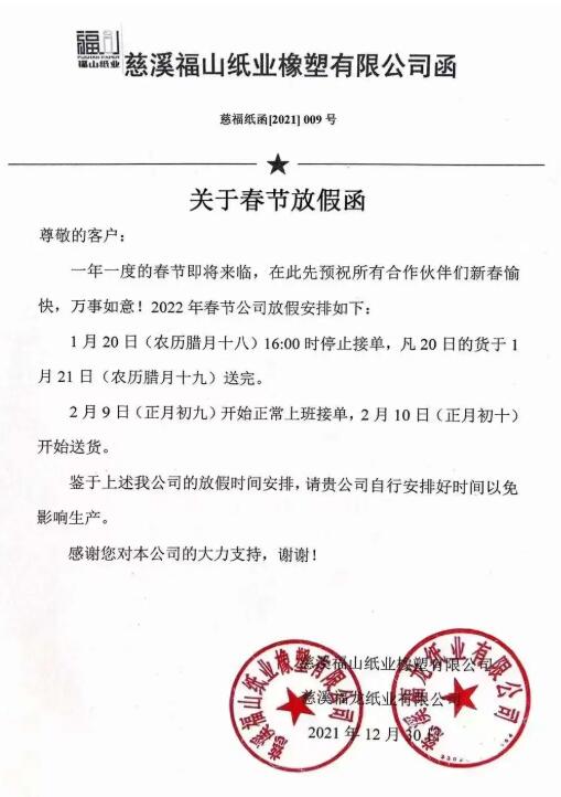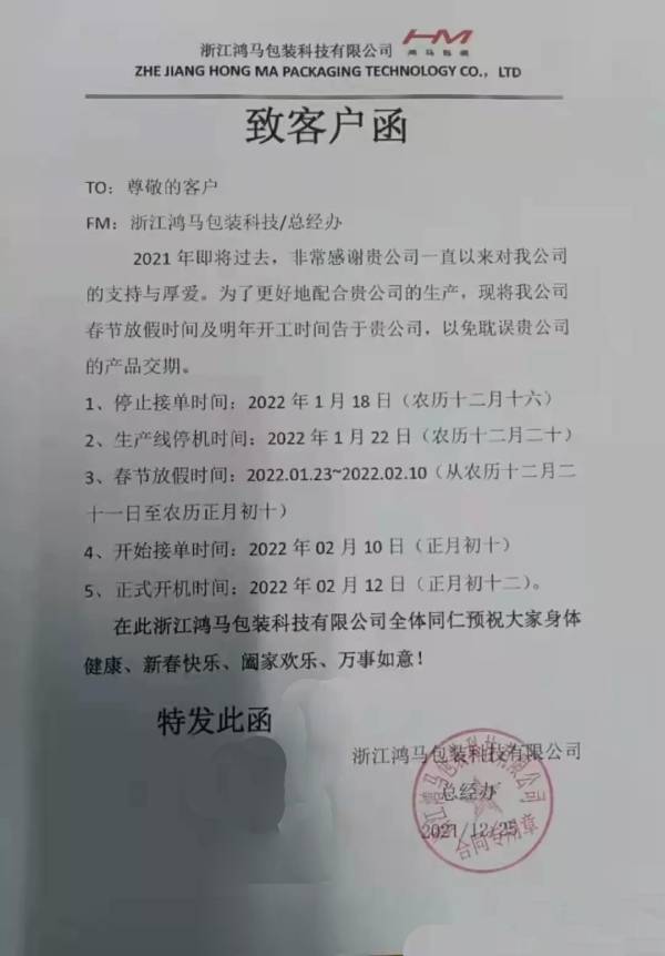 步入2022年后,發(fā)布春節(jié)放假通知函的包裝企業(yè)逐步增多。慈溪福山紙業(yè)橡塑有限公司、浙江方平紙業(yè)有限公司、寧波六和包裝有限公司/寧波日和新材料有限公司等企業(yè),也明確了停止接單、生產(chǎn)線停機、節(jié)前放假及節(jié)后上班時間。