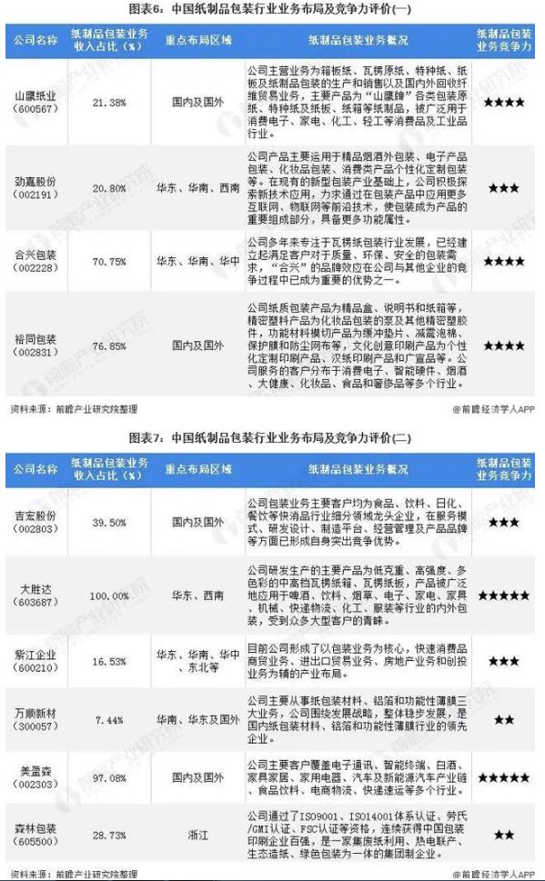 4、中國紙制品包裝行業(yè)企業(yè)布局及競爭力評價(jià) 在中國紙制品包裝行業(yè)的上市公司中,山鷹紙業(yè)、裕同包裝、美盈森等業(yè)務(wù)布局最廣,布局區(qū)域覆蓋全國級海外。其他上市企業(yè)業(yè)務(wù)布局大部分集中于特定區(qū)域。