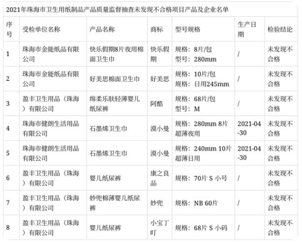 據廣東省珠海市人民政府網站消息,2021年第四季度,珠海市市場監督管理局組織開展了衛生用紙制品產品質量監督抽查。本次抽查僅涉及生產領域企業,3家受檢單位8批次產品,其中紙尿褲產品4批次,衛生巾產品4批次,均未發現不合格產品。 本次監督抽查依據GB/T28004-2011《紙尿褲(片、墊)》、GB/T 8939-2018《衛生巾(護墊)》兩個標準,對紙尿褲的滑滲量、回滲量、滲漏量、pH值、細菌菌落總數、大腸菌群、綠膿桿菌、金黃色葡萄球菌、溶血性鏈球菌、真菌菌落總數等10個項目;衛生巾的全長偏差、條質量偏差、吸水倍率、pH、交貨水分、甲醛含量、可遷移性熒光物質、其他要求、細菌總數、大腸菌群、綠膿桿菌、金黃色葡萄球菌、溶血性鏈球菌、真菌菌落總數等14個項目進行了檢測。