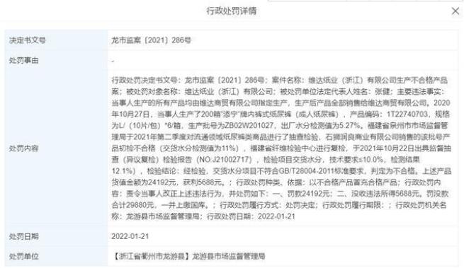 近日,中國經(jīng)濟網(wǎng)記者在天眼查發(fā)現(xiàn),維達紙業(yè)(浙江)有限公司因生產(chǎn)的紙尿褲交貨水分項目初檢復(fù)檢均不合格,被龍游縣市場監(jiān)督管理局罰款2.42萬元、沒收違法所得5688元。