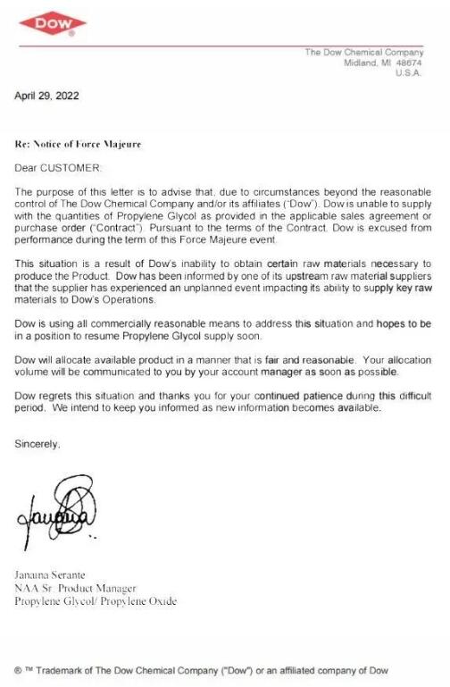 全球能源危機(jī)影響下,陶氏近日宣布受供應(yīng)商意外事故影響,丙二醇遭遇不可抗力而停供,由此引發(fā)巴斯夫、三井化學(xué)、揚(yáng)子石化等多家紙尿褲原料供應(yīng)商的連鎖斷供危機(jī)。 近日,陶氏發(fā)布緊急通知稱,受上游原材料的一家供應(yīng)商意外事故影響,中斷了其向陶氏業(yè)務(wù)供應(yīng)關(guān)鍵原材料的能力,因此,陶氏宣布丙二醇遭遇不可抗力而停供,恢復(fù)時(shí)間后續(xù)通知。