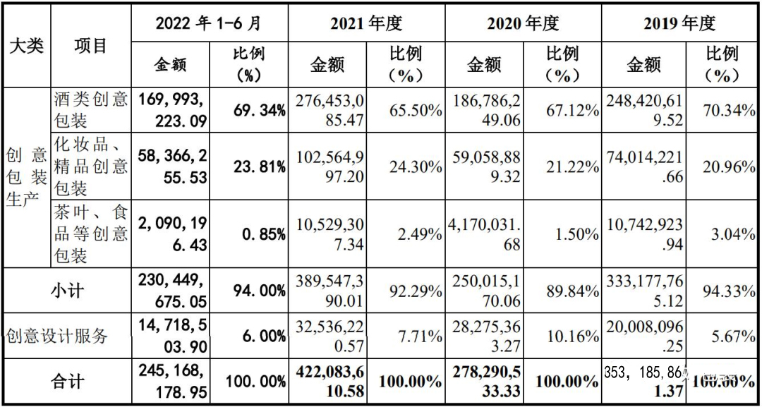 (深圳柏星龍主要財務數據和財務指標) 從營收構成來看,酒類創意包裝業務是柏星龍最大的營收來源。目前,該公司已與牛欄山、衡水老白干、古井貢酒、糊涂酒業、酒鬼酒、汾酒等知名酒業品牌建立了良好的合作關系,今年上半年該塊業務實現營收近1.7億元,在總營收的占比高達70%左右。 而化妝品、精品創意包裝,茶葉、食品等創意包裝以及創意設計服務,亦是柏星龍的主要收入來源。今年上半年,這三大板塊業務分別實現營業收入5836.63萬元、2090.20萬元和1471.85萬元,均呈現穩步增長的態勢。