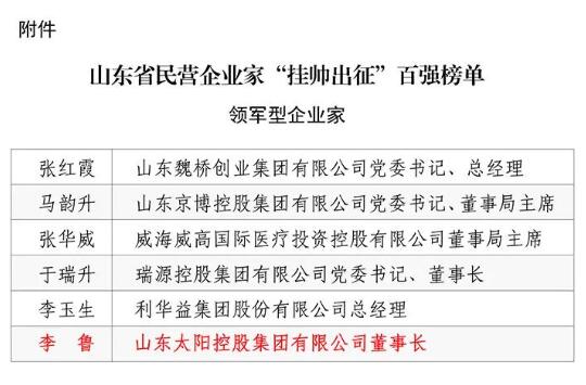 4月20日,山東省委、省政府在濟南召開全省民營經濟高質量發展工作會議,會上發布了山東省民營企業家“掛帥出征”百強榜單,包括30名領軍型企業家、40名菁英型企業家及30名新星型企業家。公司控股股東山東太陽控股集團有限公司董事長李魯榮獲山東省民營企業家“掛帥出征”百強榜領軍企業家稱號。