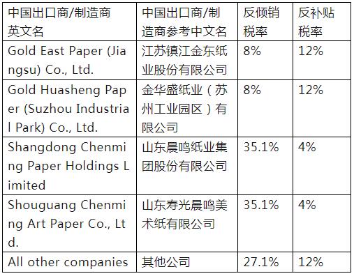 2023年8月22日,歐盟委員會(huì)發(fā)布公告稱,對(duì)原產(chǎn)于中國(guó)的銅版紙(Coated Fine Paper)作出第二次雙反日落復(fù)審終裁,裁定若取消雙反措施,涉案產(chǎn)品的傾銷及補(bǔ)貼對(duì)歐盟產(chǎn)業(yè)的損害會(huì)繼續(xù)或再度發(fā)生,因此決定繼續(xù)維持對(duì)涉案產(chǎn)品的雙反措施。裁定中國(guó)涉案企業(yè)反傾銷稅率為8%~35.1%、反補(bǔ)貼稅率為4%~12%,具體稅率詳見下表。涉案產(chǎn)品歐盟CN(Combined Nomenclature)編碼為ex 4810 13 00、ex 4810 14 00、ex 4810 19 00、ex 4810 22 00、ex 4810 29 30、ex 4810 29 80、ex 4810 99 10和ex 4810 99 80(歐盟TARIC編碼為4810130020、4810140020、4810190020、4810220020、4810293020、4810298020、4810991020和4810998020)。本案傾銷調(diào)查期為2021年1月1日~2021年12月31日,損害調(diào)查期為2018年1月1日至傾銷調(diào)查期結(jié)束。