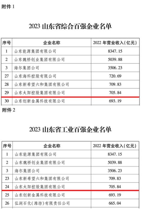 近日,省工業和信息化廳、省企業聯合會公布2023年山東省百強企業名單,公司控股股東山東太陽控股集團有限公司再次榮登榜單,位列2023山東省綜合百強企業第29位,2023山東工業百強企業第24位,彰顯了企業綠色低碳高質量發展的強勁實力。