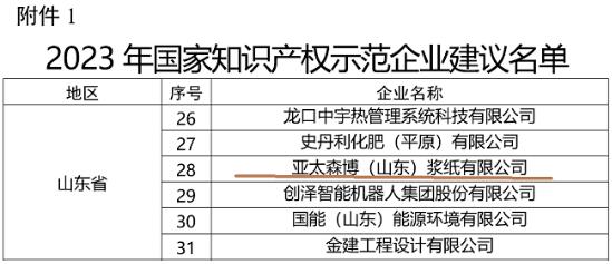 近日,國家知識產權局公布了“2023年國家知識產權優勢和示范企業”評定結果,亞太森博(山東)漿紙有限公司(下文簡稱:亞太森博)成功入選“國家知識產權示范企業”。