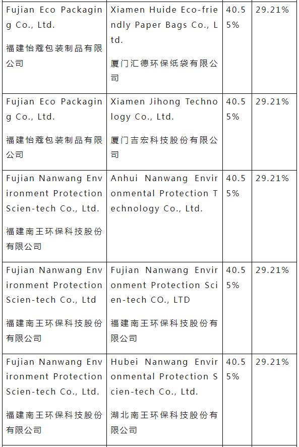 2023年12月28日,美國商務部宣布對進口自柬埔寨、中國大陸、哥倫比亞、印度、馬來西亞、葡萄牙、土耳其和越南8國及中國臺灣地區-的紙購物袋(PaperShoppingBags)作出反傾銷初裁,初步裁定柬埔寨生產商/出口商的傾銷率為10.05%~248.81%、中國大陸生產商/出口商的傾銷率為24.15%~146.32%(抵消補貼后的保證金調整為12.81%~135.77%),其中強制應訴企業DongzhengPaperbag(DaLian)Factory(大連東正紙袋制品有限公司)傾銷率為59.41%、UUPAKCo.,Ltd.(香港優優包裝有限公司)傾銷率為24.15%、獲得單獨稅率的企業傾銷率為40.55%、中國全國統一稅率146.32%(具體稅率詳見下表)、哥倫比亞生產商/出口商的傾銷率為9.48%~56.14%、印度生產商/出口商的傾銷率均為0.00%~57.87%(抵消補貼后的保證金調整為不適用~54.40%)、馬來西亞生產商/出口商的傾銷率為3.10%~112.22%、葡萄牙生產商/出口商的傾銷率為11.33%、土耳其生產商/出口商的傾銷率為26.32%~47.56%、越南生產商/出口商的傾銷率為51.25%~92.34%、中國臺灣地區生產商/出口商的傾銷率為0.00%~60.26%。美國商務部預計將于2024年3月11日對進口自馬來西亞和土耳其的涉案產品作出反傾銷終裁、于2024年5月10日對進口自其他國家和中國臺灣地區的涉案產品作出反傾銷終裁。本案涉及美國協調關稅稅號4819.30.0040和4819.40.0040項下產品。