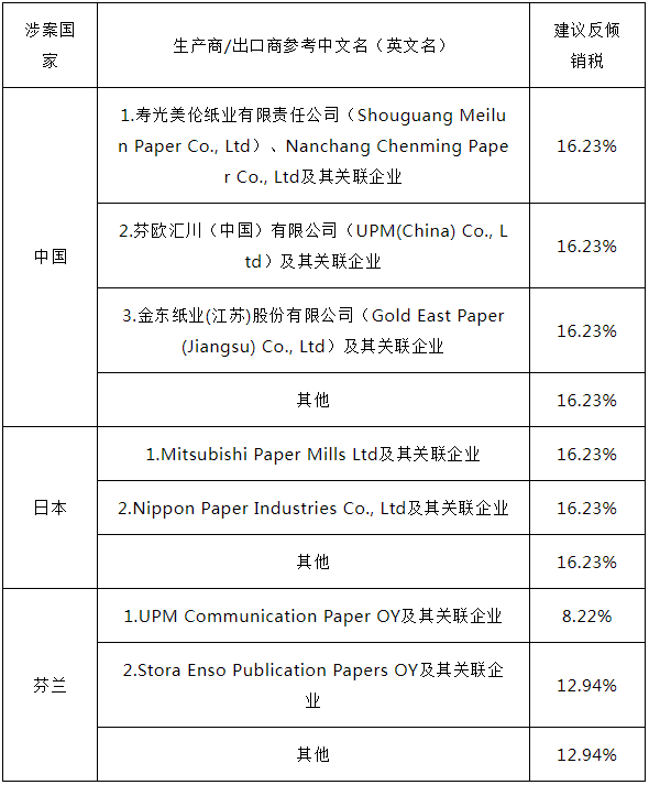 2023年12月21日,韓國貿(mào)易委員會發(fā)布第2023-18號公告(案件號23-2023-2),對原產(chǎn)于中國、日本和芬蘭的每平米重量介于55克~110克之間的涂布印刷紙(CoatedPrintingPaper)作出反傾銷第一次日落復審肯定性終裁,建議韓國企劃財政部繼續(xù)對涉案產(chǎn)品征收為期五年反傾銷稅,其中,中國和日本涉案產(chǎn)品的稅率均為16.23%、芬蘭稅率為8.22%和12.94%,稅率詳見附表。涉案產(chǎn)品的韓國稅號為4810.13.1000、4810.14.1000、4810.19.1000、4810.19.9000、4810.22.0000和4810.29.0000。 2017年7月10日,韓國對原產(chǎn)于中國、日本和芬蘭的每平米重量介于55克~110克之間的涂布印刷紙進行反傾銷調(diào)查。依據(jù)韓國企劃財政部第684號令,韓國決定自2018年7月22日起對中國、日本和芬蘭的涂布印刷紙征收反傾銷稅,措施有效期至2023年7月21日。2023年3月21日,韓國對該案啟動第一次日落復審調(diào)查。 附表:韓國對涉華涂布印刷紙反傾銷案第一次日落復審終裁建議征稅表