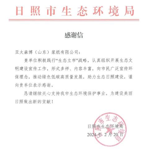 2月20日,日照市生態(tài)環(huán)境局向公司發(fā)來感謝信,對公司積極踐行“生態(tài)立市”戰(zhàn)略、認真組織生態(tài)文明建設宣傳工作、向市民廣泛宣傳環(huán)保理念、推動城市綠色低碳高質量發(fā)展、助力生態(tài)日照建設等方面的貢獻表示感謝。