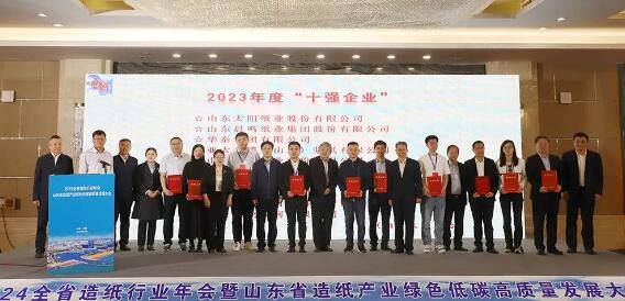 在頒發榮譽證書環節,吉興香副會長宣讀了山東協會認定“雙十”標桿企業——“2023年度‘十強企業’‘十佳企業’”通報,公司榮獲山東省造紙行業2023年度“十強企業”。作為山東省造紙產業鏈“鏈主”企業,公司牢牢把握高質量發展首要任務,積極服務國家重大戰略,堅持以做優做強為先的理念,堅持創新引領、綠色發展、數智賦能,以厚積薄發的韌性和底氣,展現出高質量可持續的發展態勢,為山東省造紙產業綠色低碳高質量發展貢獻太陽智慧和力量。