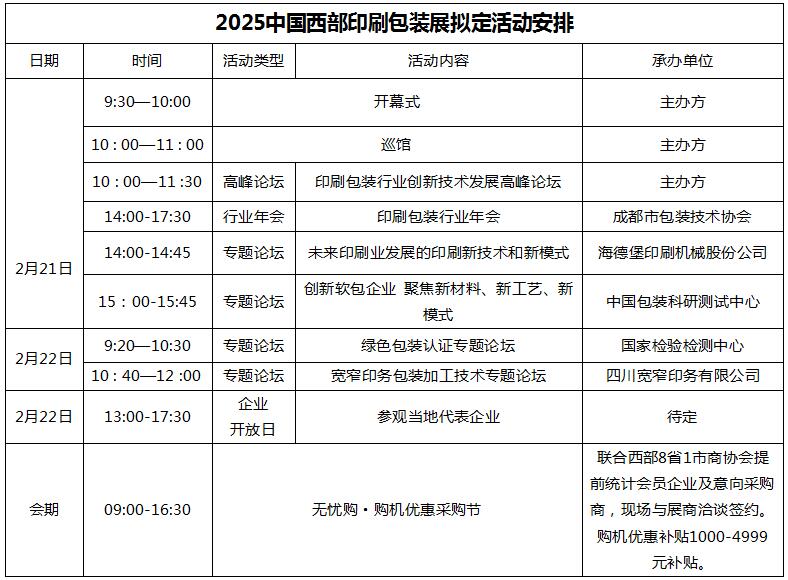 時間:2025年2月21日-23日(行業開年第一展) 地點:中國西部國際博覽城 保專業·保效果·保成交·保物流·保金融 一、組織機構 主辦單位: 四川省包裝聯合會成都市包裝技術協會 陜西省包裝技術協會重慶市包裝技術協會 云南省包裝行業協會貴州省包裝聯合會 新疆自治區包裝技術協會甘肅省包裝技術協會 全瓦通四川中展蓉創會展有限公司 支持單位: 廣東省包裝技術協會天津市包裝技術協會 山東省包裝印刷工業協會寧波市包裝行業協會 河南省包裝技術協會 遼寧省包裝聯合會 湖北省包裝聯合會 溫州市包裝聯合會 威海市包裝印刷工業協會 青島市包裝聯合會 石家莊市印刷協會 大連市包裝技術協會 承辦單位: 渤海集團(天津)國際展覽有限公司 四川中展蓉創會展有限公司