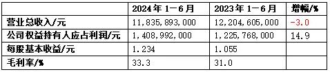 2024年8月19日,恒安國際集團有限公司公布2024年上半年業(yè)績報告。上半年恒安國際實現(xiàn)營收118.36億元(單位:人民幣,下同),同比略減3.0%;公司權益持有人應占利潤14.09億元,同比增加14.9%;基本每股收益1.234元。 1.財務摘要