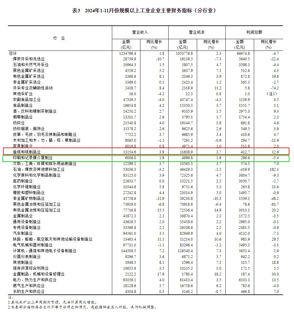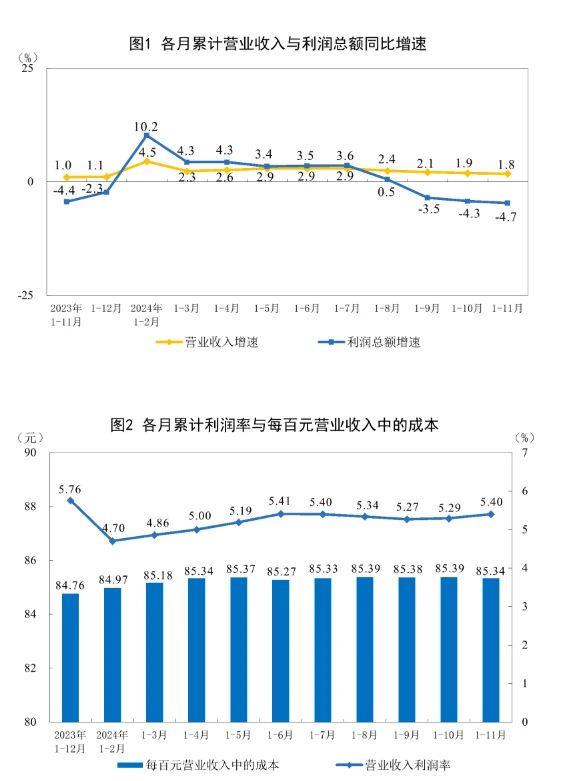 1—11月份,規(guī)模以上工業(yè)企業(yè)實(shí)現(xiàn)營(yíng)業(yè)收入123.48萬(wàn)億元,同比增長(zhǎng)1.8%;發(fā)生營(yíng)業(yè)成本105.38萬(wàn)億元,增長(zhǎng)2.3%;營(yíng)業(yè)收入利潤(rùn)率為5.40%,同比下降0.37個(gè)百分點(diǎn)。其中,造紙和紙制品業(yè)實(shí)現(xiàn)營(yíng)業(yè)收入13154.6億元,同比增長(zhǎng)3.9%;印刷和記錄媒介復(fù)制業(yè)實(shí)現(xiàn)營(yíng)業(yè)收入6006.0億元,同比增長(zhǎng)1.9%。 11月末,規(guī)模以上工業(yè)企業(yè)資產(chǎn)總計(jì)178.87萬(wàn)億元,同比增長(zhǎng)4.7%;負(fù)債合計(jì)103.51萬(wàn)億元,增長(zhǎng)4.9%;所有者權(quán)益合計(jì)75.36萬(wàn)億元,增長(zhǎng)4.6%;資產(chǎn)負(fù)債率為57.9%,同比上升0.1個(gè)百分點(diǎn)。 11月末,規(guī)模以上工業(yè)企業(yè)應(yīng)收賬款26.92萬(wàn)億元,同比增長(zhǎng)8.5%;產(chǎn)成品存貨6.57萬(wàn)億元,增長(zhǎng)3.3%。 1—11月份,規(guī)模以上工業(yè)企業(yè)每百元營(yíng)業(yè)收入中的成本為85.34元,同比增加0.37元;每百元營(yíng)業(yè)收入中的費(fèi)用為8.40元,同比增加0.02元。 11月末,規(guī)模以上工業(yè)企業(yè)每百元資產(chǎn)實(shí)現(xiàn)的營(yíng)業(yè)收入為77.7元,同比減少2.9元;人均營(yíng)業(yè)收入為183.4萬(wàn)元,同比增加6.4萬(wàn)元;產(chǎn)成品存貨周轉(zhuǎn)天數(shù)為19.8天,同比增加0.1天;應(yīng)收賬款平均回收期為66.7天,同比增加4.2天。 11月份,規(guī)模以上工業(yè)企業(yè)利潤(rùn)同比下降7.3%。 國(guó)家統(tǒng)計(jì)局工業(yè)司統(tǒng)計(jì)師于衛(wèi)寧解讀工業(yè)企業(yè)利潤(rùn)數(shù)據(jù)表示,11月份,隨著存量政策有效落實(shí),一攬子增量政策加快推出,政策組合效應(yīng)持續(xù)發(fā)揮,帶動(dòng)規(guī)模以上工業(yè)生產(chǎn)平穩(wěn)增長(zhǎng),企業(yè)效益繼續(xù)恢復(fù)。當(dāng)月工業(yè)企業(yè)營(yíng)業(yè)收入由降轉(zhuǎn)增,利潤(rùn)降幅繼續(xù)收窄,制造業(yè)高端化、智能化、綠色化深入推進(jìn)。企業(yè)效益狀況呈現(xiàn)以下特點(diǎn):工業(yè)企業(yè)當(dāng)月?tīng)I(yíng)業(yè)收入由降轉(zhuǎn)增;工業(yè)企業(yè)當(dāng)月利潤(rùn)降幅繼續(xù)收窄;制造業(yè)高端化、智能化、綠色化深入推進(jìn);“兩新”政策持續(xù)落地顯效;消費(fèi)品制造業(yè)利潤(rùn)較快增長(zhǎng)。總體看,雖然規(guī)模以上工業(yè)企業(yè)利潤(rùn)仍處下降區(qū)間,但隨著政策組合效應(yīng)持續(xù)顯現(xiàn),工業(yè)企業(yè)利潤(rùn)降幅繼續(xù)收窄,效益狀況有所改善。