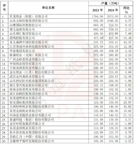 △2024年紙及紙板產(chǎn)量100萬(wàn)噸以上的省(區(qū)、市) 在《中國(guó)造紙工業(yè)2024年度報(bào)告》中,國(guó)內(nèi)重點(diǎn)造紙產(chǎn)量前30強(qiáng)企業(yè)出爐。其中,玖龍紙業(yè)以超過2000萬(wàn)噸的產(chǎn)量遙遙領(lǐng)先,太陽(yáng)紙業(yè)的年產(chǎn)量也突破了1000萬(wàn)噸,山鷹國(guó)際、理文造紙的年產(chǎn)量超過700萬(wàn)噸,其余26家紙企年產(chǎn)量在100萬(wàn)噸-460萬(wàn)噸之間。 值得一提的是,金光集團(tuán)APP旗下山東博匯集團(tuán)、廣西金桂漿紙業(yè)、寧波亞洲漿紙業(yè)、江蘇金東紙業(yè)、海南金海漿紙業(yè)、金紅葉紙業(yè)6家企業(yè)入圍,總產(chǎn)量逼近1500萬(wàn)噸。若以此數(shù)據(jù)計(jì)算,金光集團(tuán)APP在中國(guó)的產(chǎn)能僅次于玖龍紙業(yè)。