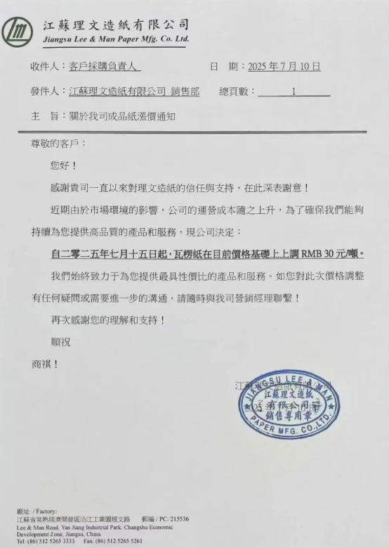 7.15起 玖龍太倉基地、江蘇理文造紙有限公司瓦楞紙價格上調
