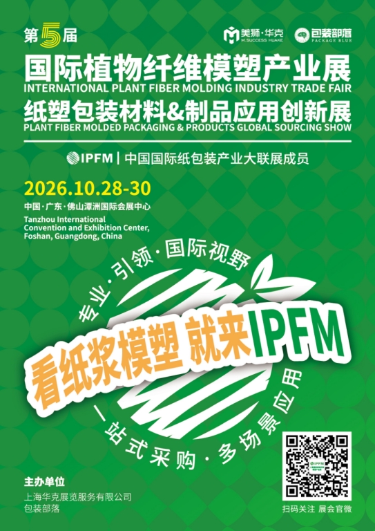 國際植物纖維模塑產業展(IPFM)是由行業社群自媒體包裝部落和中國包裝業首席媒體、商貿平臺美獅傳媒·華克展覽強強聯合,以紙漿模塑產業為獨立專題核心策展,聯動全產業鏈的專屬國際盛會。 2026年10月28-30日,IPFM2026將在中國·廣東·佛山潭洲國際會展中心隆重舉行!邁入第五屆的IPFM將匯聚行業智慧,以創新驅動新質生產力,賦能紙漿模塑產業轉型升級提速,快速步入高質量健康發展階段;同時積極開拓國際、國內消費應用端商機,彰顯紙漿模塑綠色力量的無限潛力。
